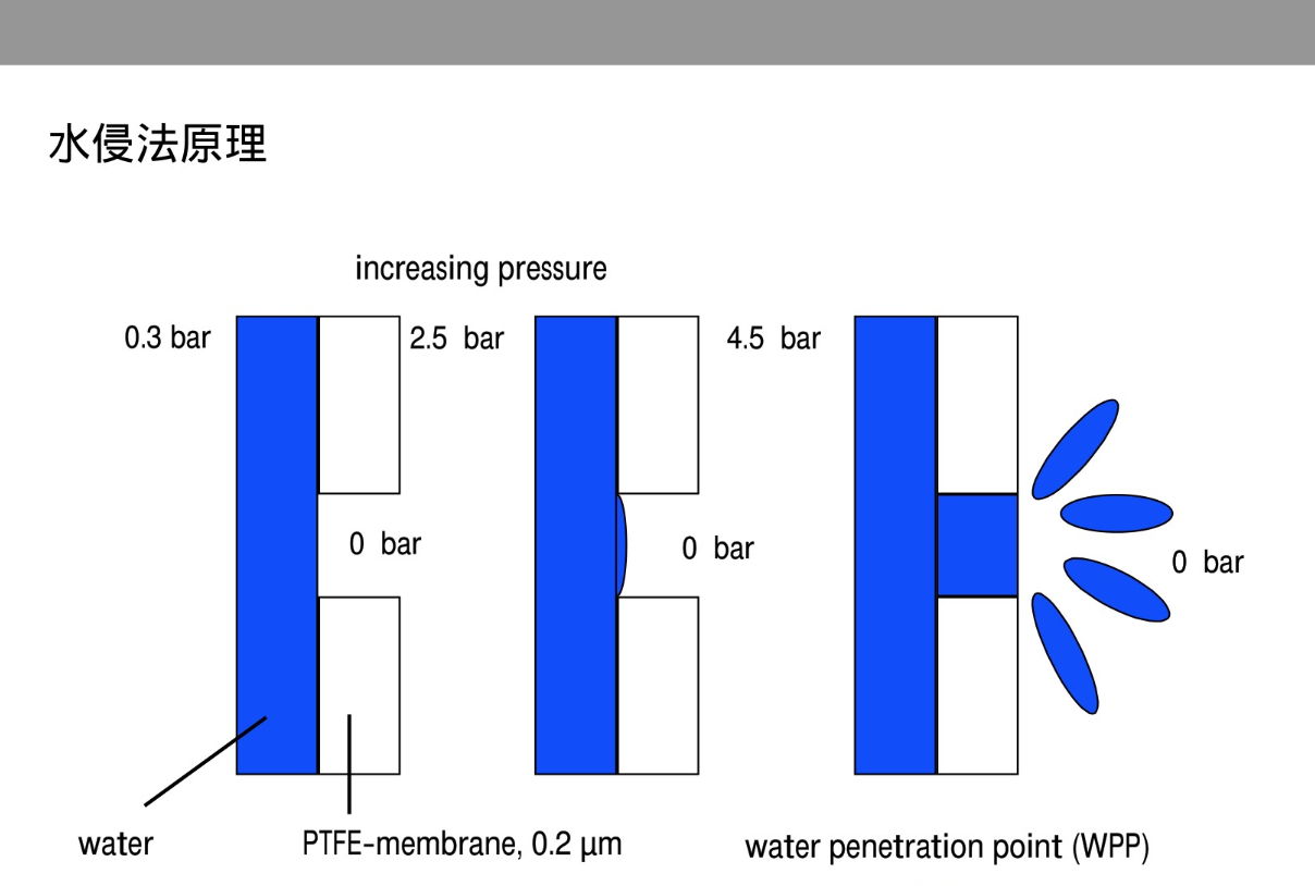 WIT是以水为介质进行测试的,施加的压力必须足以克服膜孔中的毛细管压力才能使水自由流过疏水微孔膜的膜孔,这个起始临界压力叫作“水穿透点压力(WPP)”,WPP由过滤膜的材质和疏水性决定,与膜孔径呈反比。